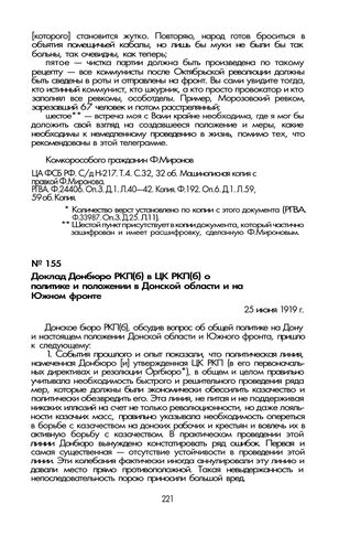 Доклад Донбюро РКП(б) в ЦК РКП(б) о политике и положении в Донской области и на Южном фронте. 25 июня 1919 г. // РЦХИДНИ. Ф. 17. Оп. 112. Д. 6. Л. 44, 44 об. Машинописный экз.