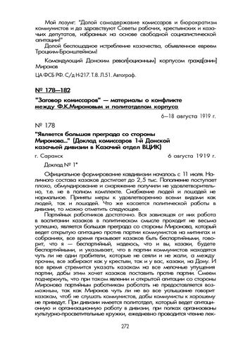 «Заговор комиссаров»— материалы о конфликте между Ф.К. Мироновым и политотделом корпуса. «Является большая преграда со стороны Миронова...» (Доклад комиссаров 1-й Донской казачьей дивизии в Казачий отдел ВЦИК). Г. Саранск, 6 августа 1919 г. // ЦА ФСБ РФ. С/д Н-217. Т. 4. С. 46, 46 об. Заверенная копия с печатью Казачьего отдела.