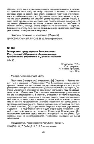 Телеграмма председателя Реввоенсовета Республики Л.Д. Троцкого об организации гражданского управления в Донской области. 12 августа 1919 г. // РЦХИДНИ. Ф. 17. Оп. 84. Д. 19. Л. 18. Заверенная копия.
