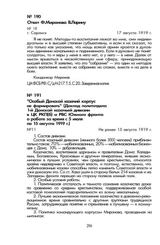 «Особый Донской казачий корпус не формировать» (Доклад политотдела 1-й Донской казачьей дивизии в ЦК РКП(б) и РВС Южного фронта о работе за время с 5 июля по 15 августа 1919 г.). Не ранее 15 августа 1919 г.