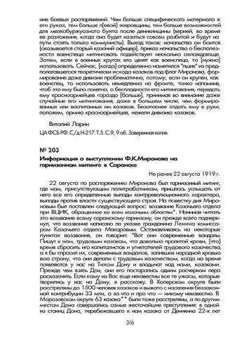 Информация о выступлении Ф.К. Миронова на гарнизонном митинге в Саранске. Не ранее 22 августа 1919 г. // ЦА ФСБ РФ. С/д Н-217. Т. 8. С. 95. Машинописная копия с копии.