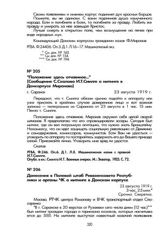 «Положение здесь отчаянное...» (Сообщение С. Скалова И.Т. Смилге о митинге в Донкорпусе Миронова). Г. Саранск, 23 августа 1919 г. // РГВА. Ф. 246. Оп. 6. Д. 1. Л. 8. Машинописная копия с правкой И.Т. Смилги. Опубл. в кн.: Смилга И.Т. Военные очерки. М.: Экватор, 1923. С. 72.