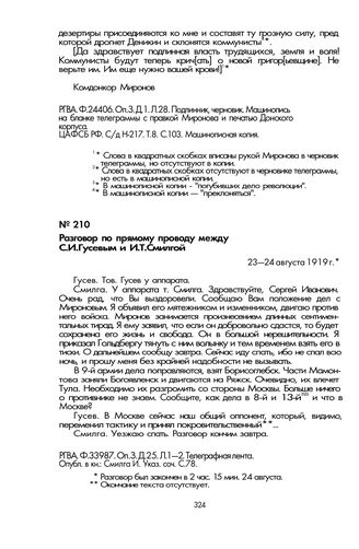 Разговор по прямому проводу между С.И. Гусевым и И.Т. Смилгой. 23—24 августа 1919 г. // РГВА. Ф. 33987. Оп. 3. Д. 25. Л. 1—2. Телеграфная лента. Опубл. в кн.: Смилга И. Указ. соч. С. 78.