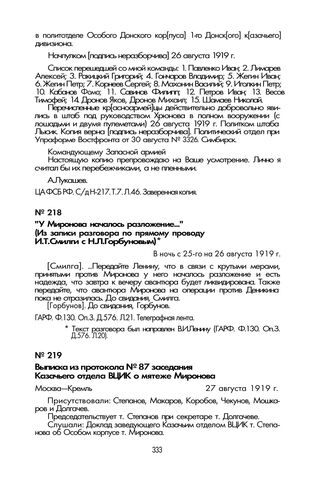 Выписка из протокола № 87 заседания Казачьего отдела ВЦИК о мятеже Миронова. Москва, 27 августа 1919 г. // ГАРФ. Ф. 1235. Оп. 83. Д. 4. Л. 34 об. Подлинник. РЦХИДНИ. Ф. 17. Оп. 65. Д. 116. Л. 103. Заверенная копия. ЦА ФСБ РФ. С /д Н-217. Т. 4. С. 59. Заверенная копия.