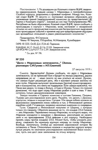 «Дела с Мироновым затягиваются...» (Запись разговора С.И. Гусева с И.Т. Смилгой). 27 августа 1919 г. // РГВА. Ф. 6. Оп. Ю. Д. 131. Л. 91—92. Телеграфная лента.