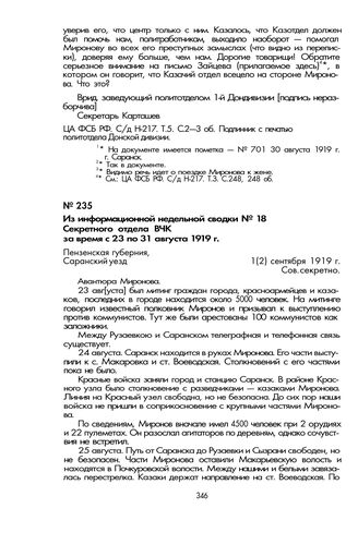 Из информационной недельной сводки № 18 Секретного отдела ВЧК за время с 23 по 31 августа 1919 г. Пензенская губерния, Саранский уезд, 1 (2) сентября 1919 г. // ЦА ФСБ РФ. Ф. 1. Оп. 3. Д. 191. Л. 12—13. Машинописная копия.