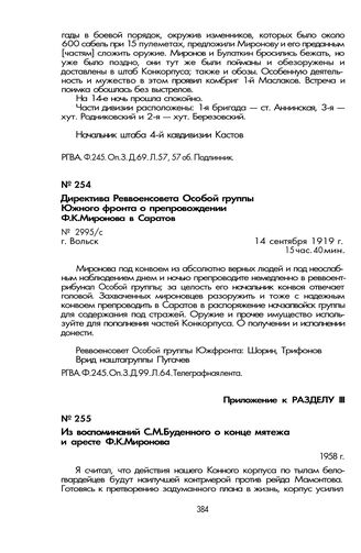 Директива Реввоенсовета Особой группы Южного фронта о препровождении Ф.К. Миронова в Саратов. Г. Вольск, 14 сентября 1919 г.