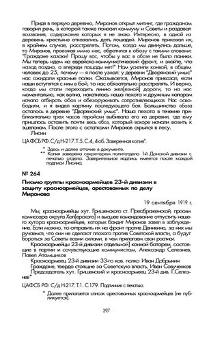Письмо группы красноармейцев 23-й дивизии в защиту красноармейцев, арестованных по делу Миронова. 19 сентября 1919 г. // ЦА ФСБ РФ. С/д Н-217. Т. 1. С. 179. Подлинник с печатью.