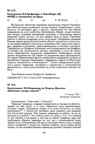 Телеграмма В.А. Трифонова в Политбюро ЦК РКП(б) о положении на Дону. 27 мая 1920 г.