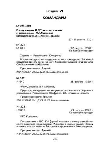 Распоряжение Л.Д. Троцкого в связи с назначением Ф.К. Миронова командующим 2-й Конной армией. 28 августа 1920 г. // РГВА. Ф. 33987. Оп. 3. Д. 359. Л. 162. Машинописный экз.
