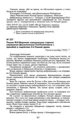 Письмо Ф.К. Миронова заведующему отделом управления Донисполкома А.А. Копяткевичу с просьбой о содействии 2-й Конной армии. После 6 сентября 1920 г. // ГАРО. Ф. Р-97. Оп. 1. Д. 123. Л. 482—483 об. Подлинник. Автограф Миронова.