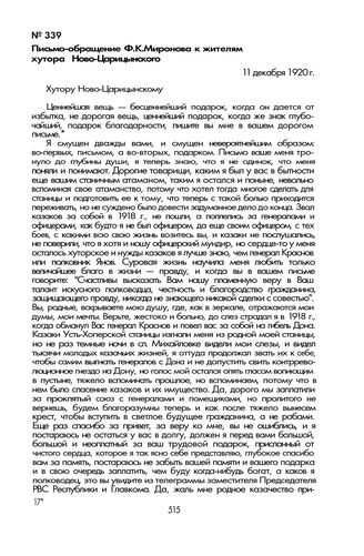 Письмо-обращение Ф.К. Миронова к жителям хутора Ново-Царицынского. 11 декабря 1920 г.