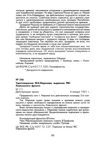 Удостоверение Ф.К. Миронова, выданное РВС Кавказского фронта. 6 января 1921 г. // ЦА ФСБ РФ. С/д Н-217. Т. 2. С. 27. Подлинник на бланке РВС Кавказского фронта.