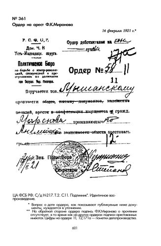 Ордер на арест Ф.К. Миронова. 14 февраля 1921 г. // ЦА ФСБ РФ. С/д Н-217. Т. 2. С. 11. Подлинник. Идентичное воспроизведение.