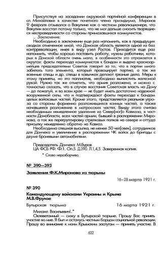 Заявление Ф.К. Миронова из тюрьмы. Командующему войсками Украины и Крыма М.В. Фрунзе. 16 марта 1921 г.
