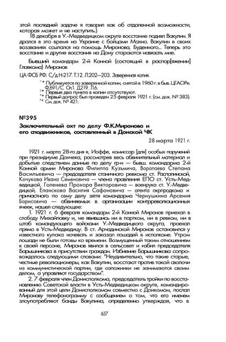 Заключительный акт по делу Ф.К. Миронова и его сподвижников, составленный в Донской ЧК. 28 марта 1921 г. // ЦА ФСБ РФ. С/д В-217. Т. 2. Л. 554—555. Подлинник.