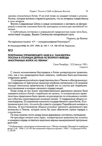 Телеграмма управляющего МИД В.Н. Ламздорфа послам в столицах держав по вопросу вывода иностранных войск из Пекина. Санкт-Петербург, 12/25 августа 1900 г. // Ф. Посольство в Вашингтоне. Оп. 512/1. Д. 1. Л. 167-168 об. Копия. Обзор сношений с Японией по корейским делам. Спб., 1906. С. 47-49; «Красный архив». 1926. Т. 14. Документ № 24. С. 28-29.