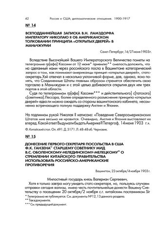 Всеподданнейшая записка В.Н. Ламздорфа императору Николаю II об американском толковании принципа «открытых дверей» в Маньчжурии. Санкт-Петербург, 14/27 июня 1903 г.