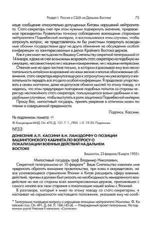 Донесение А.П. Кассини В.Н. Ламздорфу о позиции вашингтонского кабинета по вопросу о локализации военных действий на Дальнем Востоке. Вашингтон, 23 февраля/8 марта 1905 г. // Ф. Канцелярия МИД. Оп. 470.1905 г. Д. 121. Т. 1. Л. 35-37о6. Подлинник.