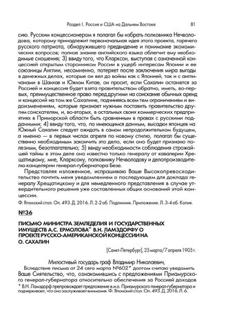 Письмо министра земледелия и государственных имуществ А.С. Ермолова В.Н. Ламздорфу о проекте русско-американской концессии на о. Сахалин. [Санкт-Петербург], 25 марта/7 апреля 1905 г. // Ф. Японский стол. Оп. 493. Д. 2016. Л. 78. Подлинник.
