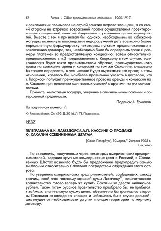 Главная Серия «Россия. XX век. Документы» Россия и США. Дипломатические отношения. 1900-1917 Телеграмма В.Н. Ламздорфа А.П. Кассини о продаже о. Сахалин Соедине...