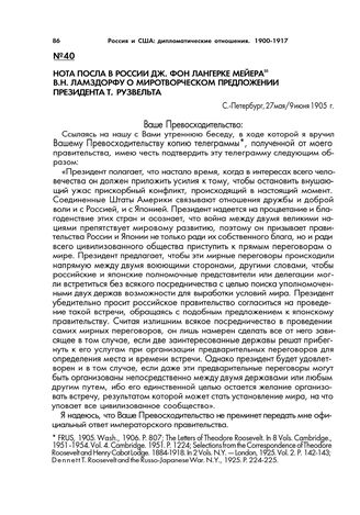 Нота посла в России Дж. фон Лангерке Мейера В.Н. Ламздорфу о миротворческом предложении президента Т. Рузвельта. Санкт-Петербург, 27 мая/9 июня 1905 г. // Ф. Японский стол. Оп. 493. Д. 621. Л. 27-27 об. Пер. с англ. Подлинник.