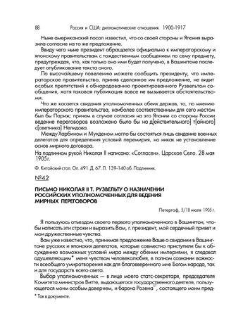 Письмо Николая II Т. Рузвельту о назначении российских уполномоченных для ведения мирных переговоров. Петергоф, 5/18 июля 1905 г.