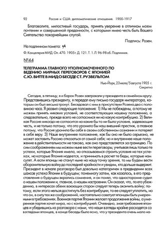 Телеграмма главного уполномоченного по ведению мирных переговоров с Японией С.Ю. Витте в МИД о беседе с Т. Рузвельтом. Нью-Йорк, 23 июля/5 августа 1905 г. // Ф. Китайский стол. Оп. 491. Д. 69. Л. 71 -72 об. Копия.