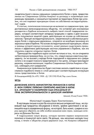Донесение агента Министерства финансов в Китае Л. фон Гойера первому секретарю миссии в Китае Б.К. Арсеньеву о намерении США отказаться от прав экстерриториальности в Цинской империи. Шанхай, 23 мая/5 июня 1908 г. // Ф. Миссия в Пекине. Оп. 761. Д. 489. Л. 166-172. Подлинник.