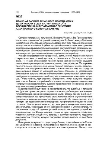 Памятная записка временного поверенного в делах России в США В.Н. Крупенского в Государственный департаменте действиях американского консула в Харбине. Вашингтон, 27 мая/9 июня 1908 г. // Ф. Канцелярия МИД. Оп. 470. 1908 г. Д. 139. Л. 265-267. Копия. Пер. с фр.
