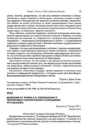 Донесение Р.Р. Розена А.П. Извольскому о перспективах участия России в соглашении Рут — Такахира. Вашингтон, 2/15 марта 1909 г.