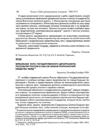 Вербальная нота Государственного департамента посольству России в США об объеме полномочий Общества КВЖД. Вашингтон, 24 октября/6 ноября 1909 г.