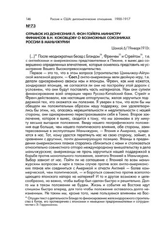 Отрывок из донесения Л. фон Гойера министру финансов В.Н. Коковцову о возможных союзниках России в Маньчжурии. Шанхай, 6/19 января 1910 г. // Ф. Миссия в Пекине. Оп. 761. Д. 491. Л. 24-37. Подлинник.