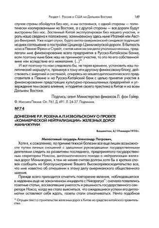 Донесение Р.Р. Розена А.П. Извольскому о проекте «коммерческой нейтрализации» железных дорог Маньчжурии. Вашингтон, 6/19 января 1910 г.