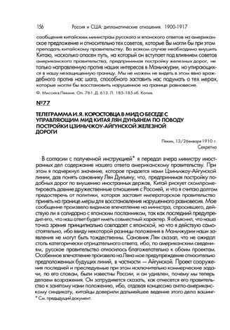 Главная Серия «Россия. XX век. Документы» Россия и США. Дипломатические отношения. 1900-1917 Телеграмма И.Я. Коростовца в МИД о беседе с управляющим МИД Китая Л...