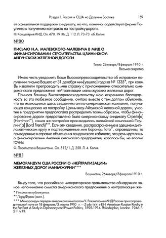 Меморандум США России о «нейтрализации» железных дорог Маньчжурии. Вашингтон, 26 января/8 февраля 1910 г. // Ф. Посольство в Вашингтоне. Оп. 512/1. Д. 258. Л. 14-16об. Копия. Пер. с англ.