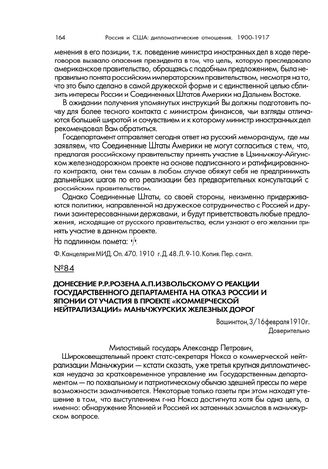 Донесение Р.Р. Розена А.П. Извольскому о реакции Государственного департамента на отказ России и Японии от участия в проекте «коммерческой нейтрализации» маньчжурских железных дорог. Вашингтон, 3/16 февраля 1910 г.