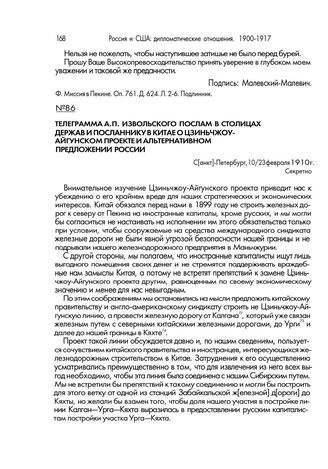 Телеграмма А.П. Извольского послам в столицах держав и посланнику в Китае о Цзиньчжоу-Айгунском проекте и альтернативном предложении России. С[анкт]-Петербург, 10/23 февраля 1910 г. // Ф. Посольство в Вашингтоне. Оп. 512/1. Д. 258. Копия.