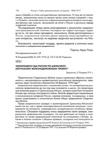 Меморандум США России по Цзиньчжоу-Айгунскому железнодорожному проекту. Вашингтон, 5/18 апреля 1910 г. // Ф. Китайский стол. Оп. 491. Д. 1098. Л. 30-36. Подлинник. Пер. с англ.