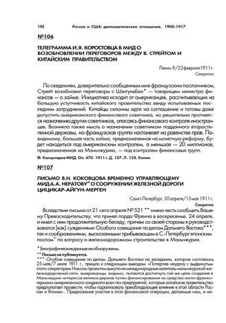 Телеграмма И.Я. Коростовца в МИД о возобновлении переговоров между В. Стрейтом и китайским правительством. Пекин, 9/22 февраля 1911 г. // Ф. Канцелярия МИД. Оп. 470. 1911 г. Д. 107. Л. 158. Копия.
