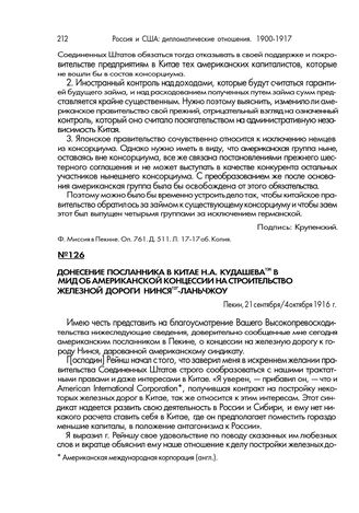 Донесение посланника в Китае Н.А. Кудашева в МИД об американской концессии на строительство железной дороги Нинся — Ланьчжоу. Пекин, 21 сентября/4 октября 1916 г.
