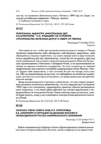 Телеграмма министра иностранных дел Б.В. Штюрмера Н.А. Кудашеву об условиях строительства железных дорог к северу от Пекина. Петроград 4/17 октября 1916 г. // Ф. Посольство в Вашингтоне. Оп. 512/4. Д. 145. Л. 98. Копия.