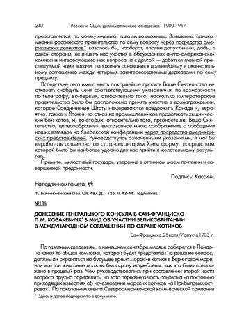 Донесение генерального консула в Сан-Франциско П.М. Козакевича в МИД об участии Великобритании в международном соглашении по охране котиков. Сан-Франциско, 25 июля/7 августа 1903 г.