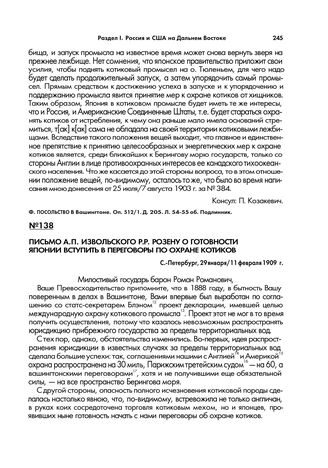 Письмо А.П. Извольского Р.Р. Розену о готовности Японии вступить в переговоры по охране котиков. Санкт-Петербург, 29 января/11 февраля 1909 г.