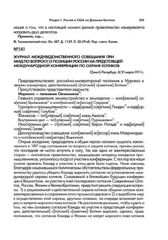 Журнал междуведомственного совещания при МИД по вопросу о позиции России на предстоящей Международной конференции по охране котиков. С[анкт]-Петербург, 8/21 марта 1911 г.
