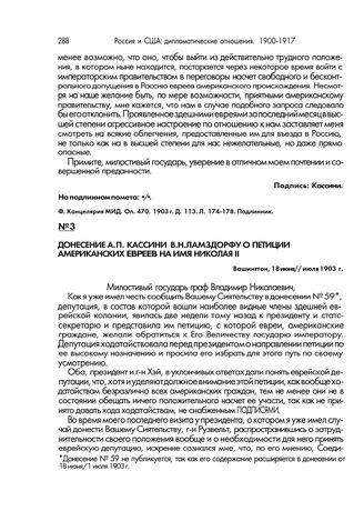 Донесение А.П. Кассини В.Н. Ламздорфу о петиции американских евреев на имя Николая II. Вашингтон, 18 июня/1 июля 1903 г. // Ф. Канцелярия МИД. Оп. 470. 1903 г. Д. 113. Л. 202-204. Подлинник.