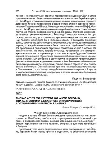 Письмо агента Министерства финансов России в США Г.А. Виленкина С.Д. Сазонову о прогерманской агитации еврейской прессы в Америке. Лондон, 21 августа/3 сентября 1914 г.