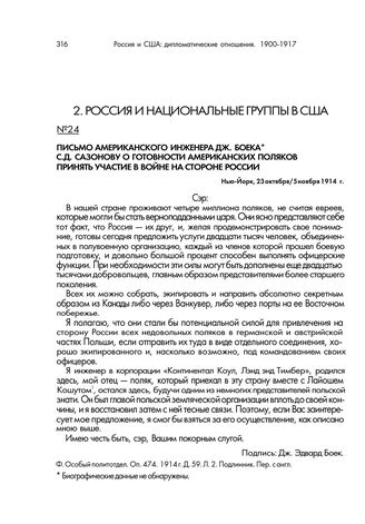 Письмо американского инженера Дж. Боека С.Д. Сазонову о готовности американских поляков принять участие в войне на стороне России. Нью- Йорк, 23 октября/5 ноября 1914 г. // Ф. Особый политотдел. Оп. 474. 1914 г. Д. 59. Л. 2. Подлинник. Пер. с англ.