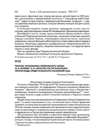 Письмо начальника Генерального штаба М.А. Беляева А.А. Нератову об организации пропаганды среди польского населения США. Петроград. 22 января/4 февраля 1916 г. // Ф. Особый политотдел. Оп. 474. 1914 г. Д. 59. л. 19-20 об. Подлинник.