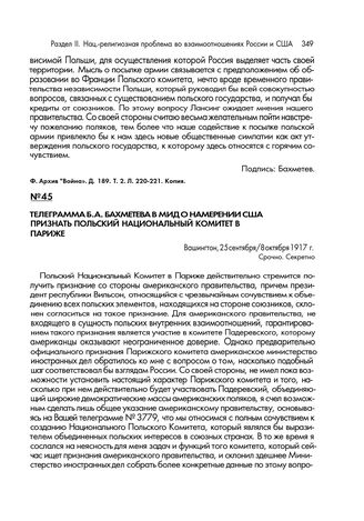 Телеграмма Б.А. Бахметева в МИД о намерении США признать Польский национальный комитет в Париже. Вашингтон, 25 сентября/8 октября 1917 г.